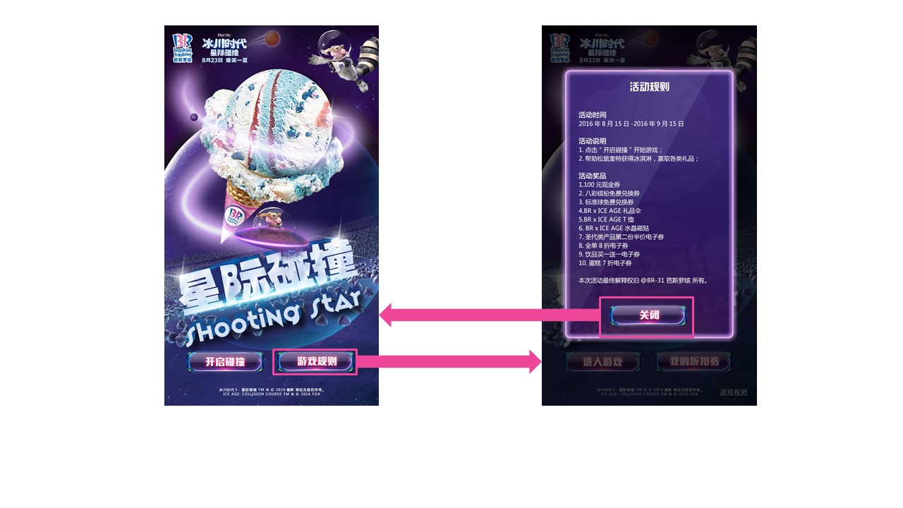芭斯罗缤冰激凌星际碰撞游戏为够更好的契合新品冰淇淋“星际碰撞”这个主题,所以在H5游戏中加入了碰撞元素,通过酷炫华丽的碰撞效果,加深受众的感官体验。
